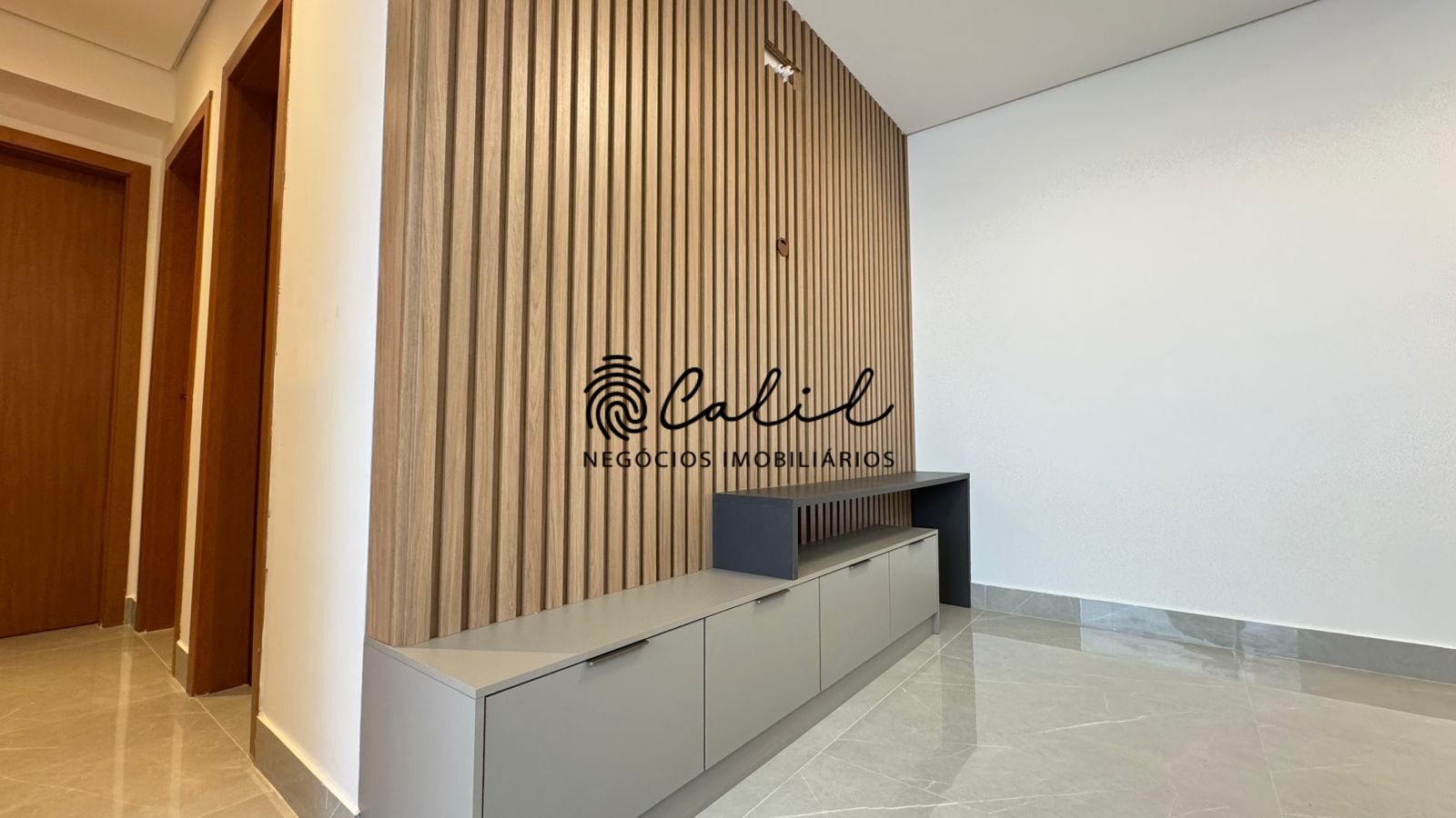- Sala de estar com lindo painel de TV integrada com a cozinha