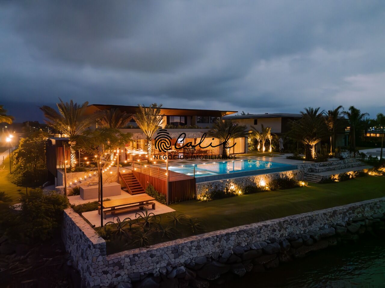 No subsolo, há uma ampla sala de jogos, lavanderia, banheiro e um quarto de apoio para funcionários. A garagem coberta acomoda vários veículos. A casa possui energia solar, gerador e deck para atracação de embarcações de grande porte.