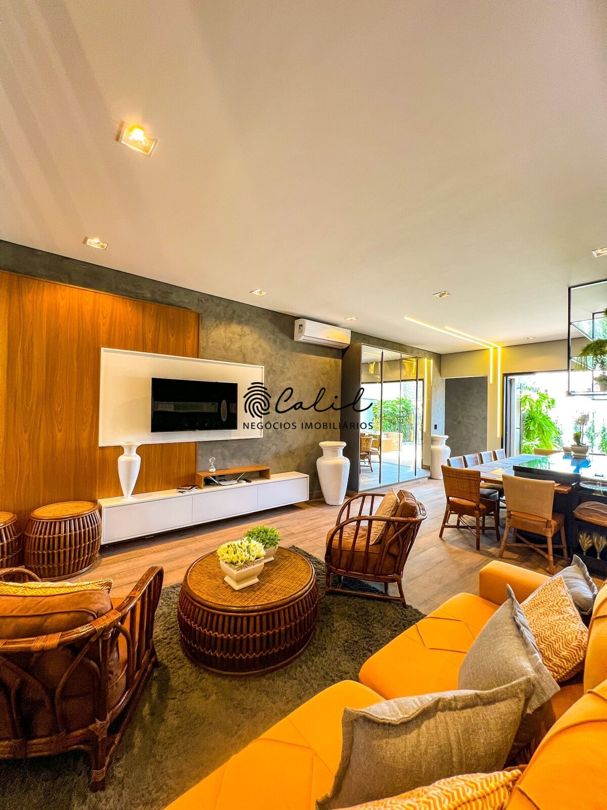 Sala de estar, sala de jantar, área gourmet integrada.