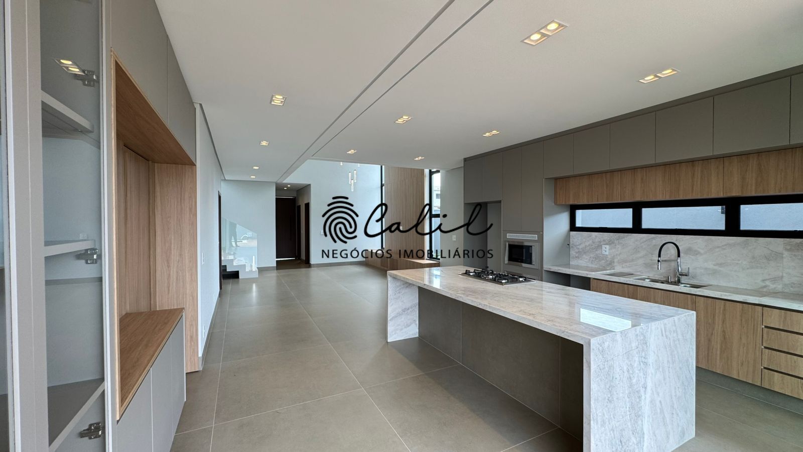 Cozinha com cooktop, forno elétrico e microondas integrada com sala de jantar.